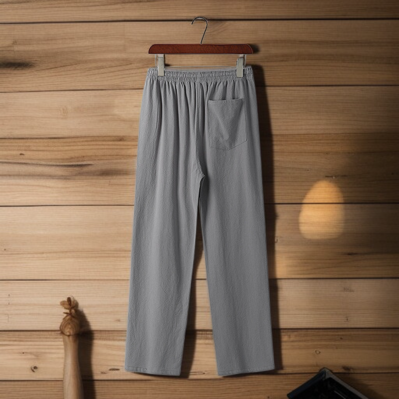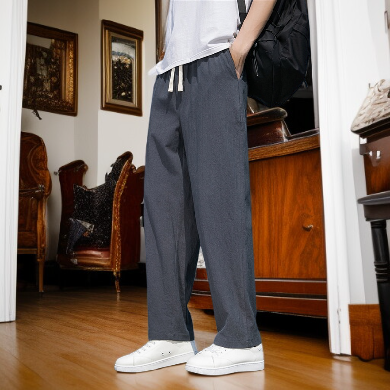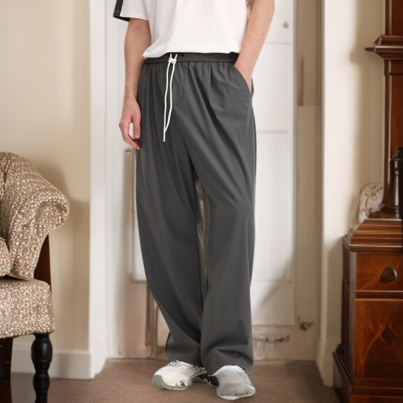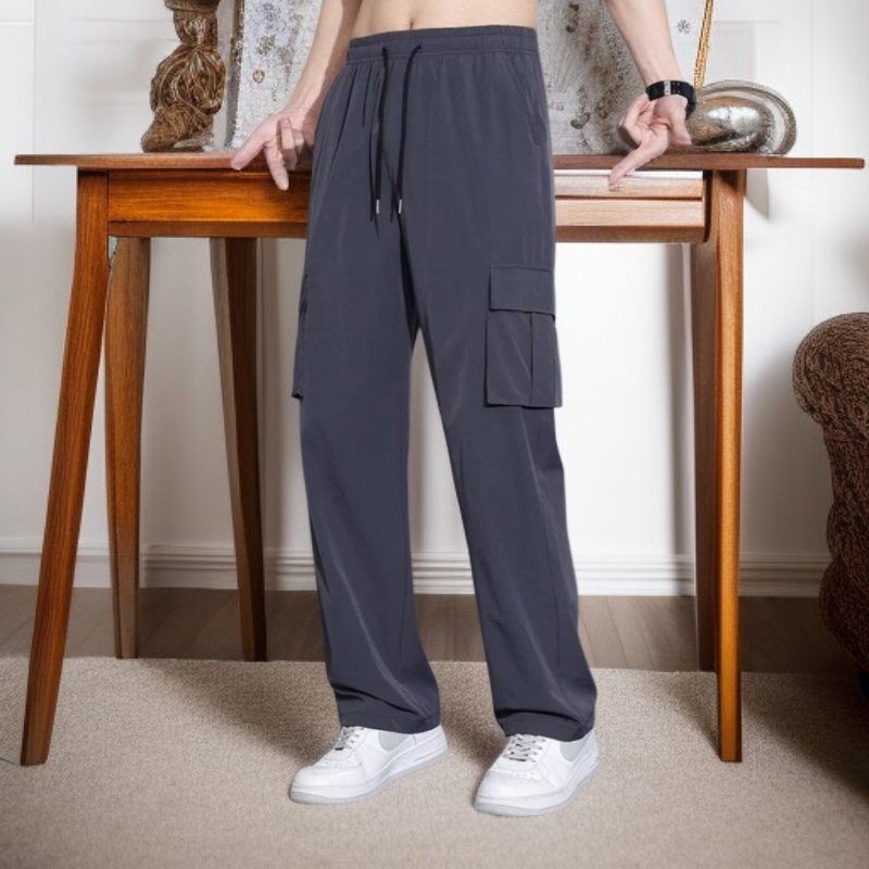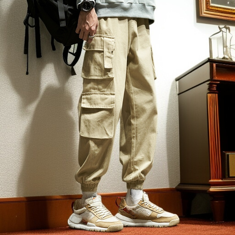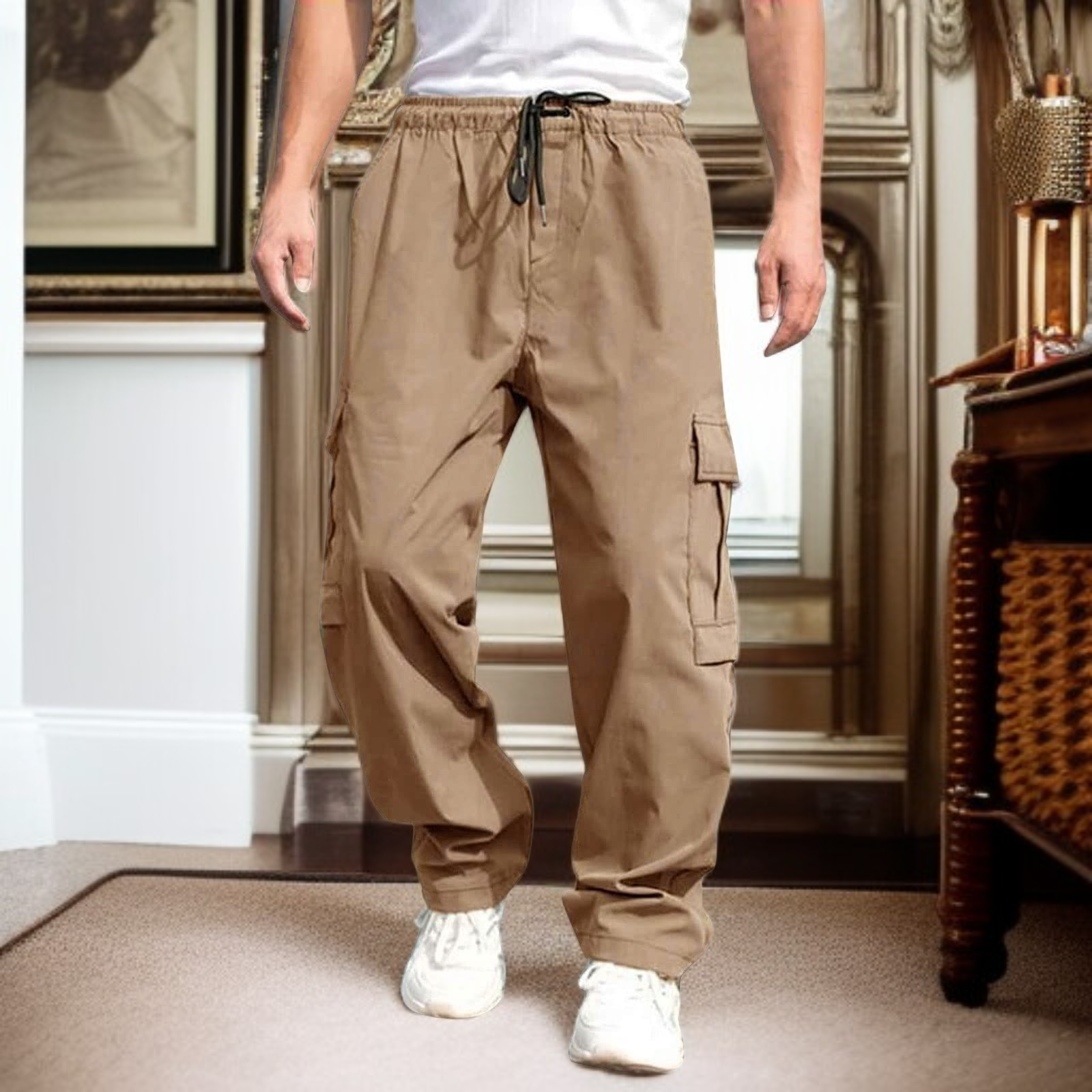 ドローストリング付き裾と複数のポケットを備えた、ゆったりとしたメンズカーゴパンツ